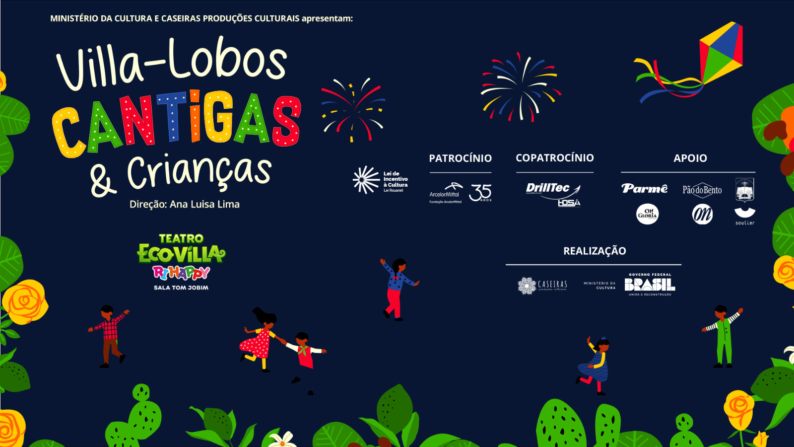 “Villa-Lobos, Cantigas e Crianças” é um espetáculo teatral infantil multilinguagem, com projeções de animações 2D, bonecos, danças, brincadeiras e muita música. A partir das cantigas de rodas selecionada pelo maestro Villa-Lobos, fazemos um passeio pela cultura popular brasileira, proporcionando um contato pouco usual com a instrumentação do Quinteto Villa-Lobos que nos honra com a sua presença em cena, além de um percussionista e cinco atores-cantores.
